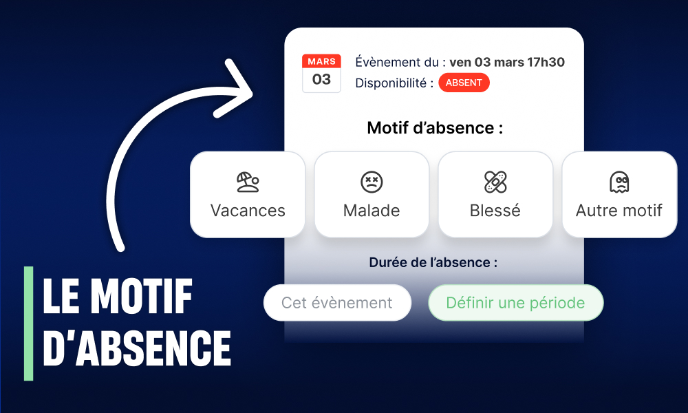 Une équipe prépare son dernier match de championnat. Trois jours avant, le gardien passe en « absent ». Avec le motif d’absence, le coach voit immédiatement que c’est une blessure – il peut appeler son remplaçant sans attendre, sans avoir à envoyer trois messages pour comprendre la situation.
